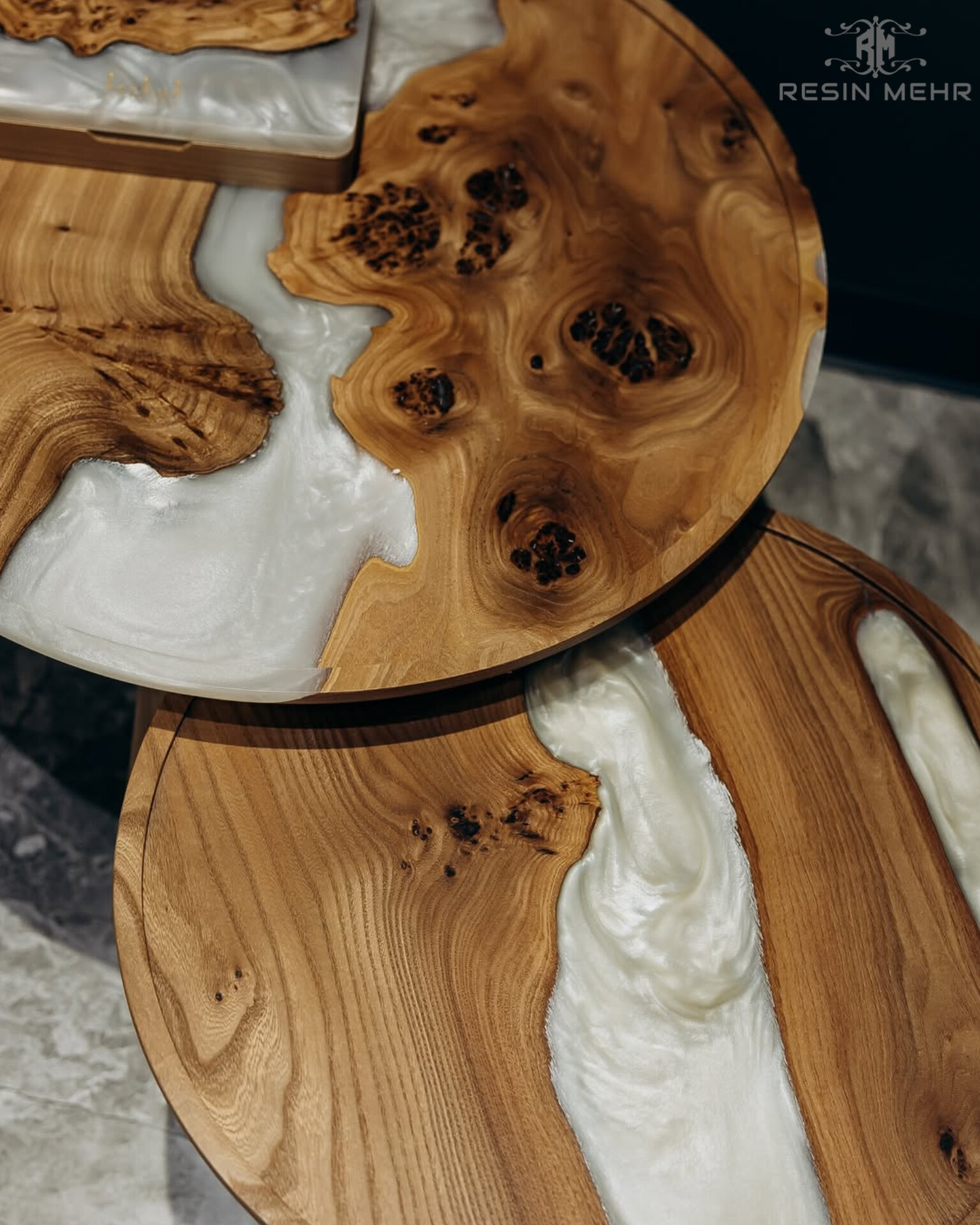 جلومبلی-عسلی رزینی ترکیب چوب جوش گردو با رزین اپوکسی به رنگ سفید صدفی با پوشش نهایی پلی اورتاننیمه مات و پایه چوبی با چوب گردو. قطر میز ۷۰سانت و ارتفاع ۴۵ سانت می باشد. ضخامت میز ۳.۵ سانت می باشد که یک پله نیمسانتی داخل میز سی انسی شده و کار رو بسیار جذاب تر کرده که به شکل سفارشی نیزقابل تولید است