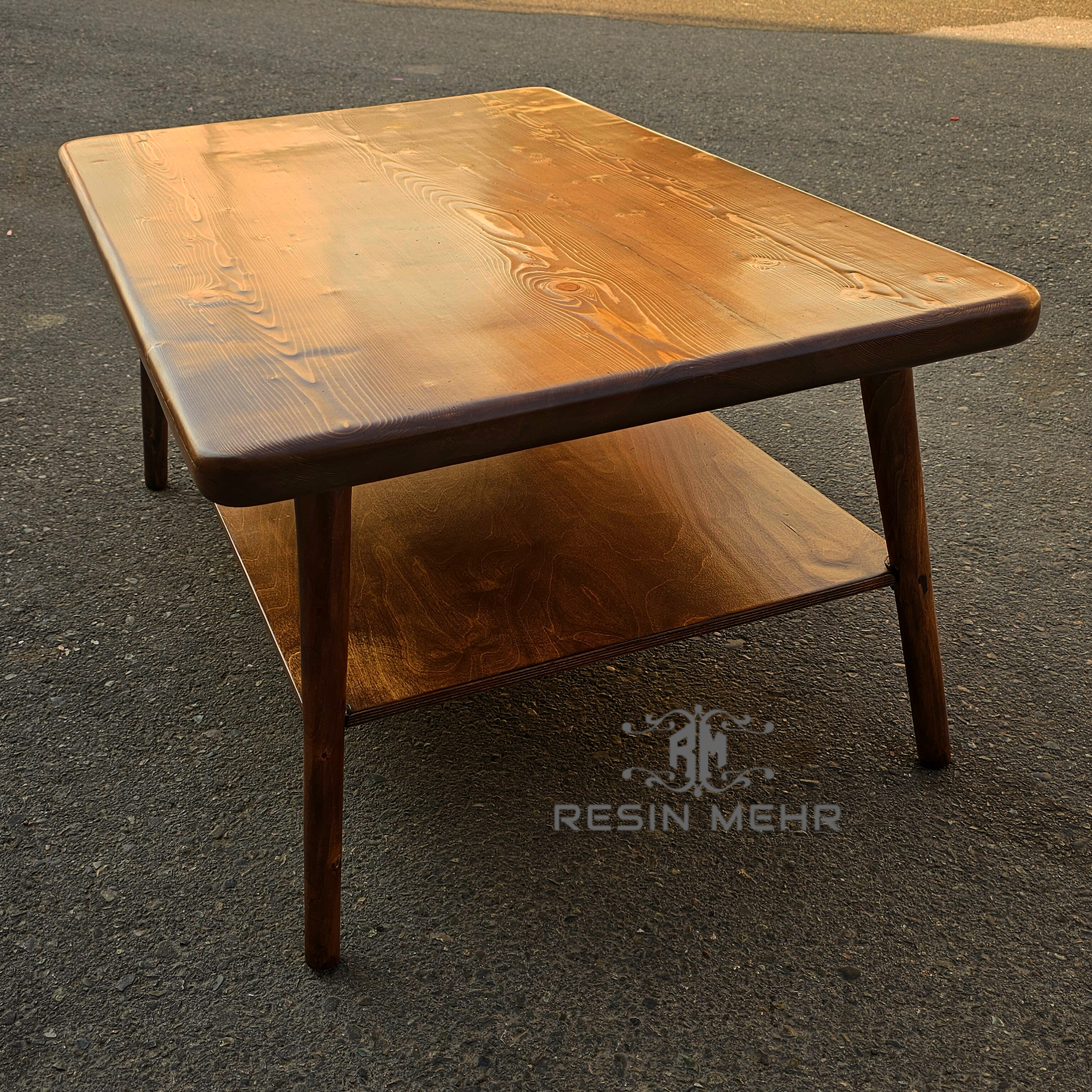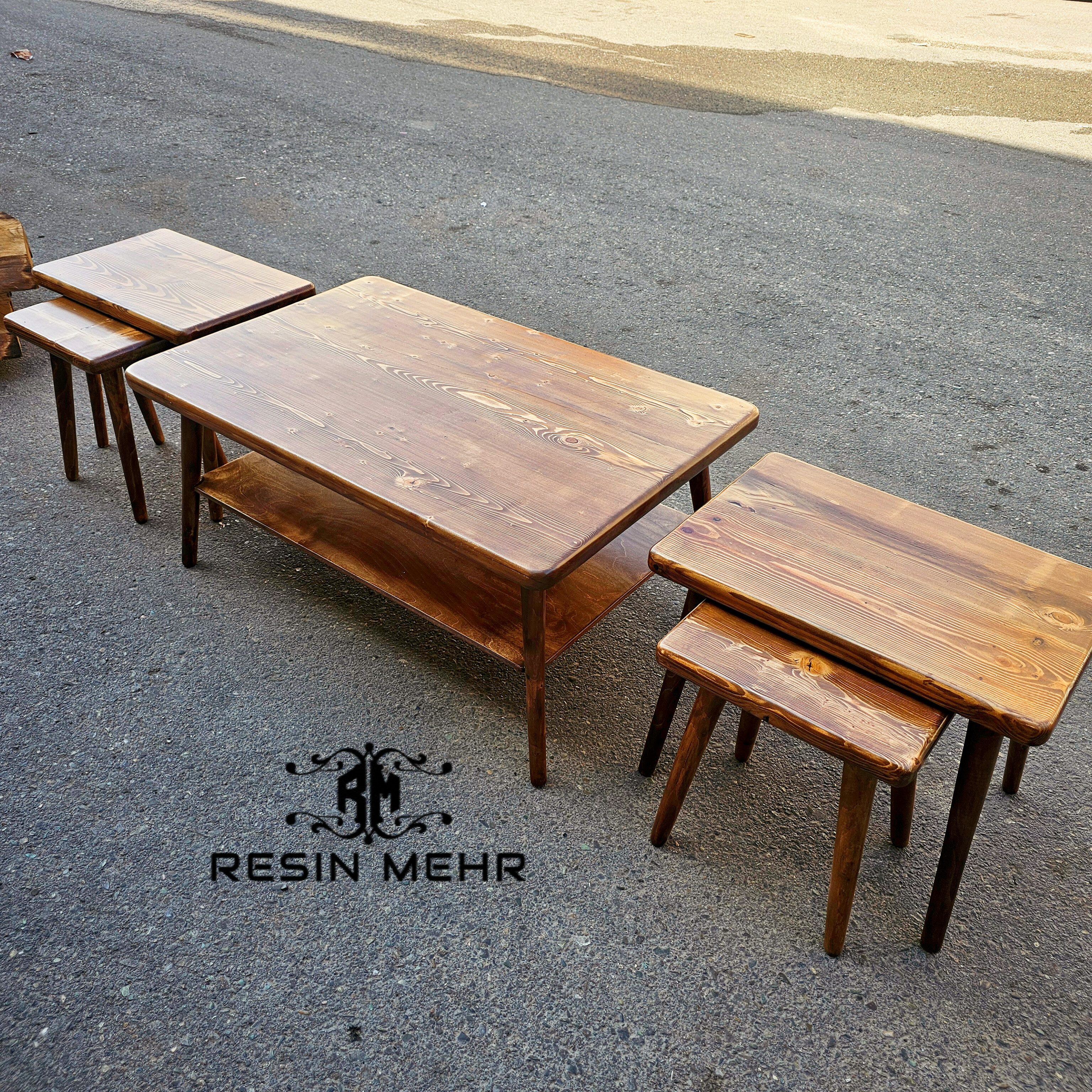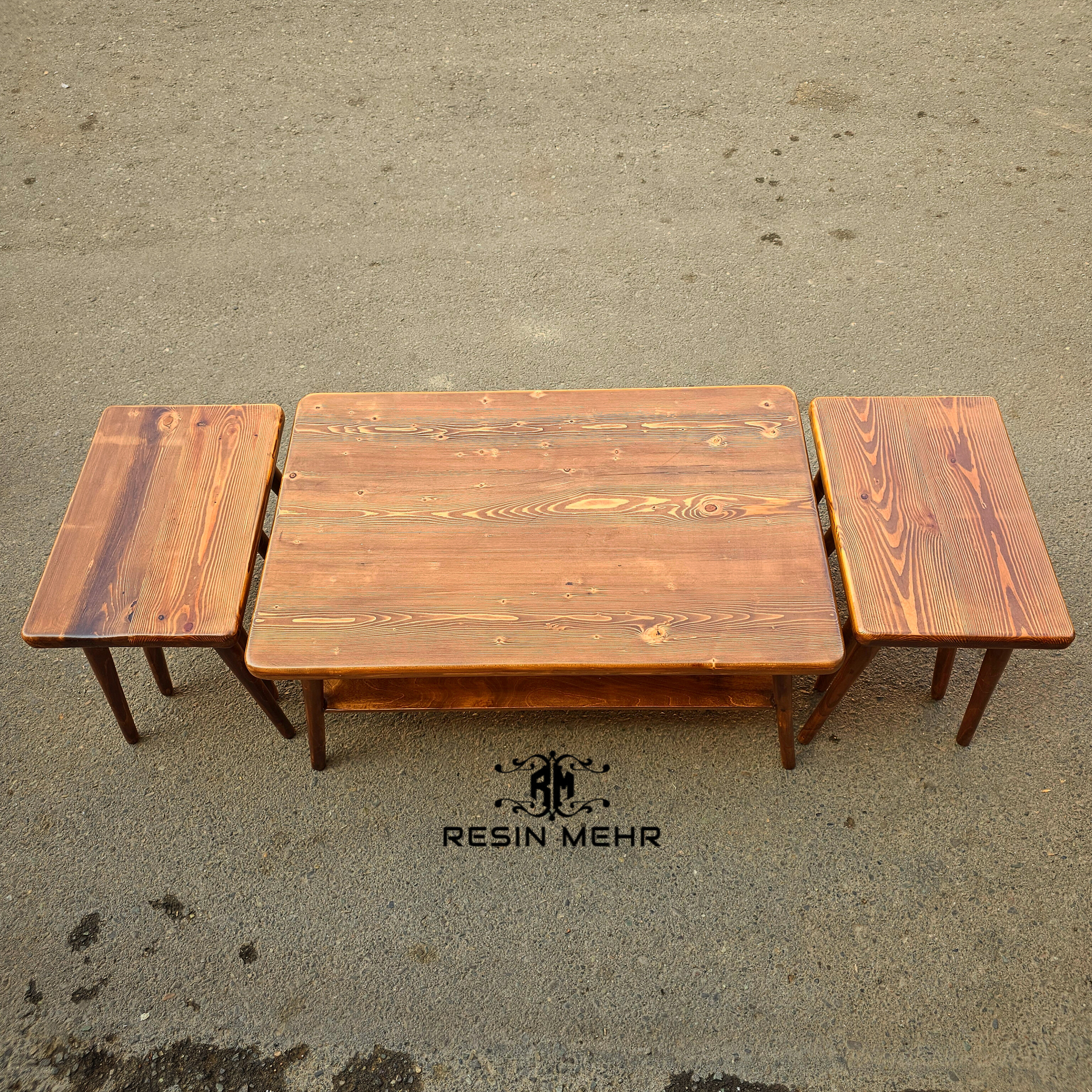 جلومبلی-عسلی کلاسیک با چوب نَرّاد روسی با پوشش نهایی پلی اورتاننیمه مات و پایه چوبی با چوب نراد روسی. ابعاد میز جلومبلی طول ۱۱۰ و عرض ۷۰سانت و دو طبقه و ارتفاع ۴۵ سانت و عسلی ها نیز به تناسب کوچک تر هستند. ضخامت میز ها ۴ سانت می باشد.