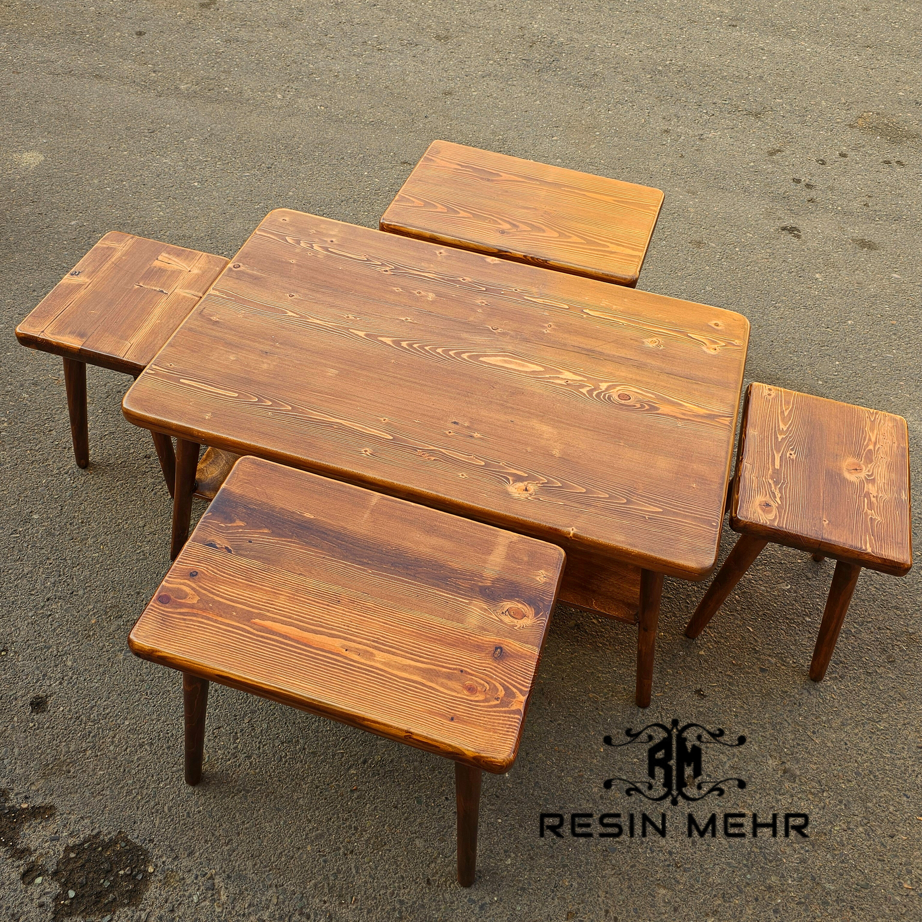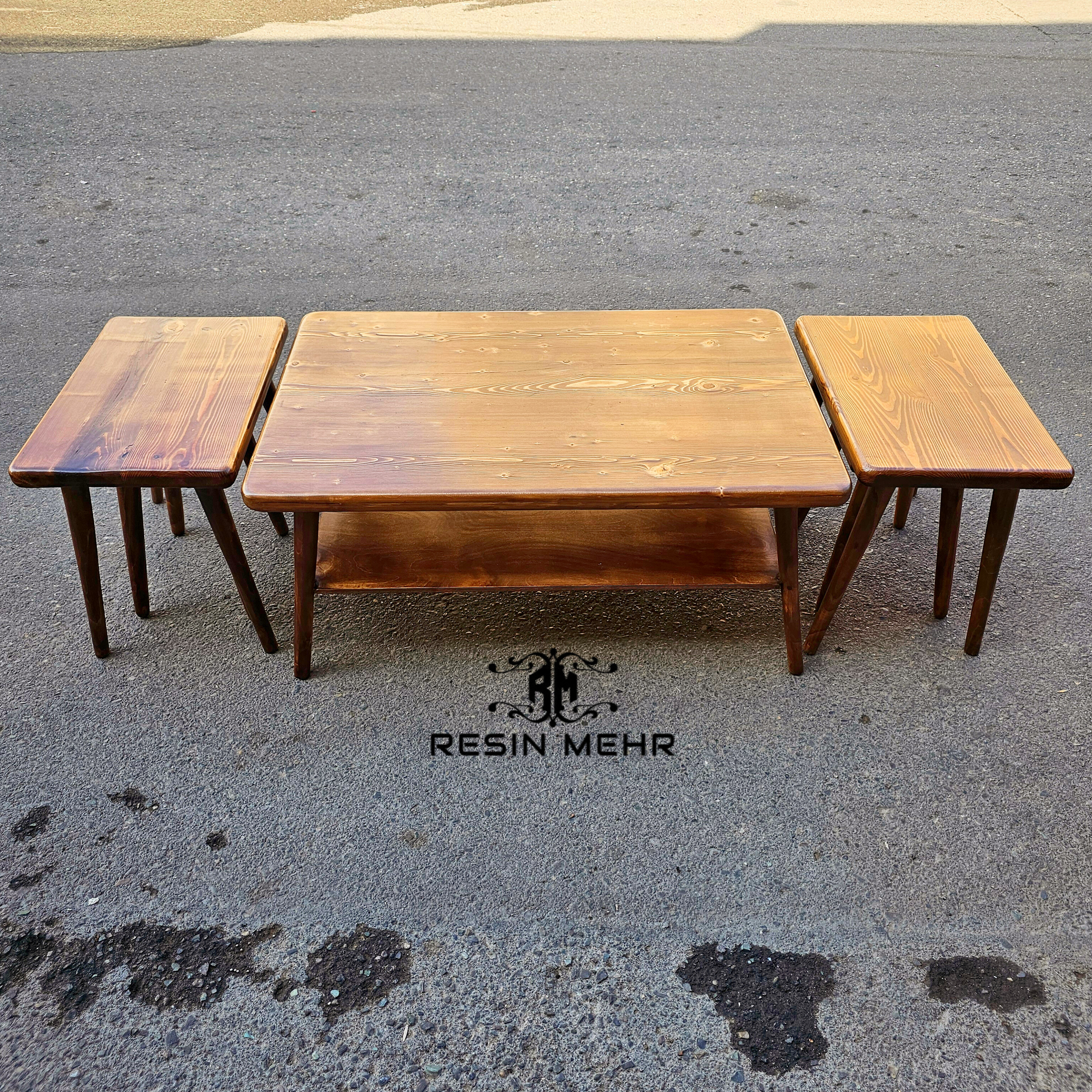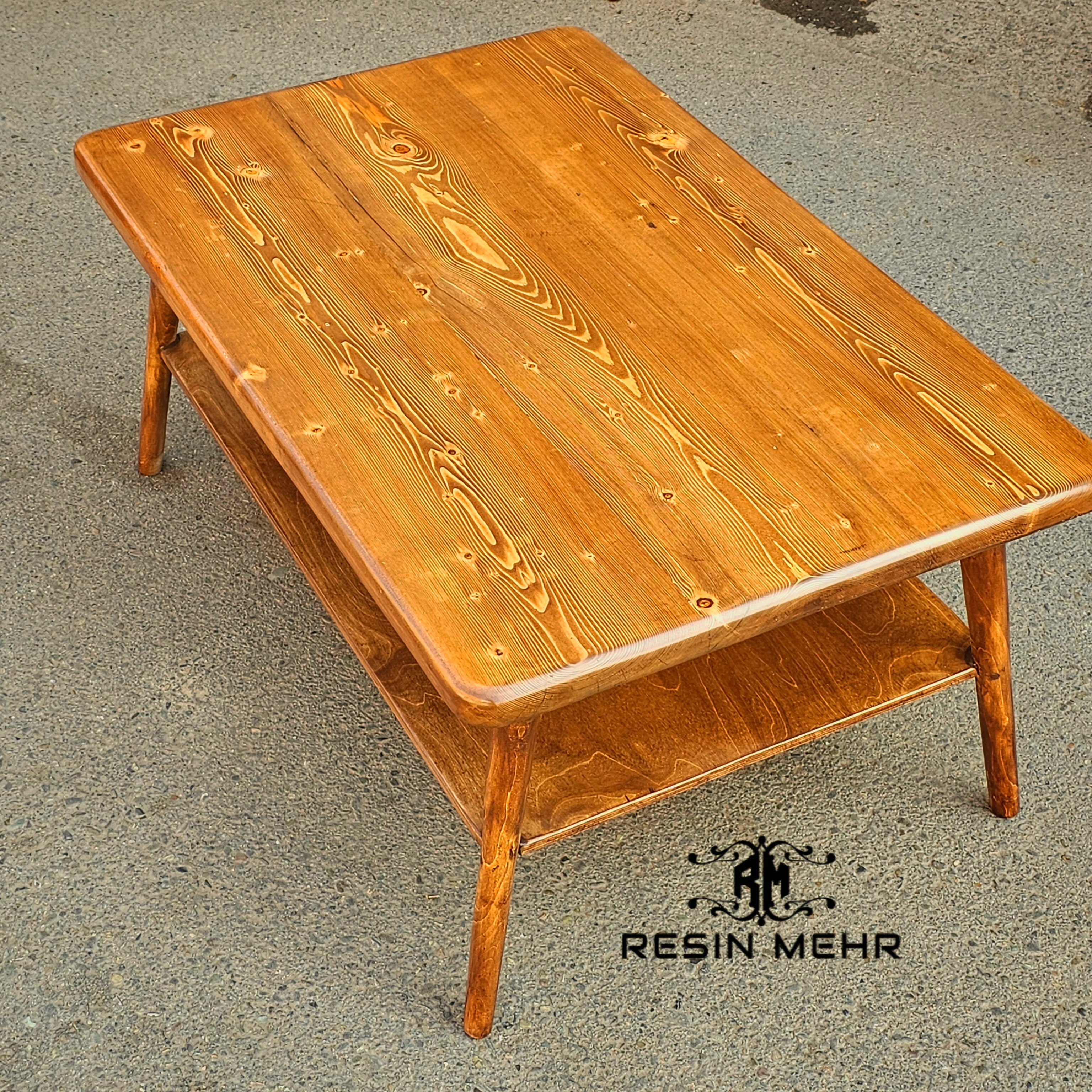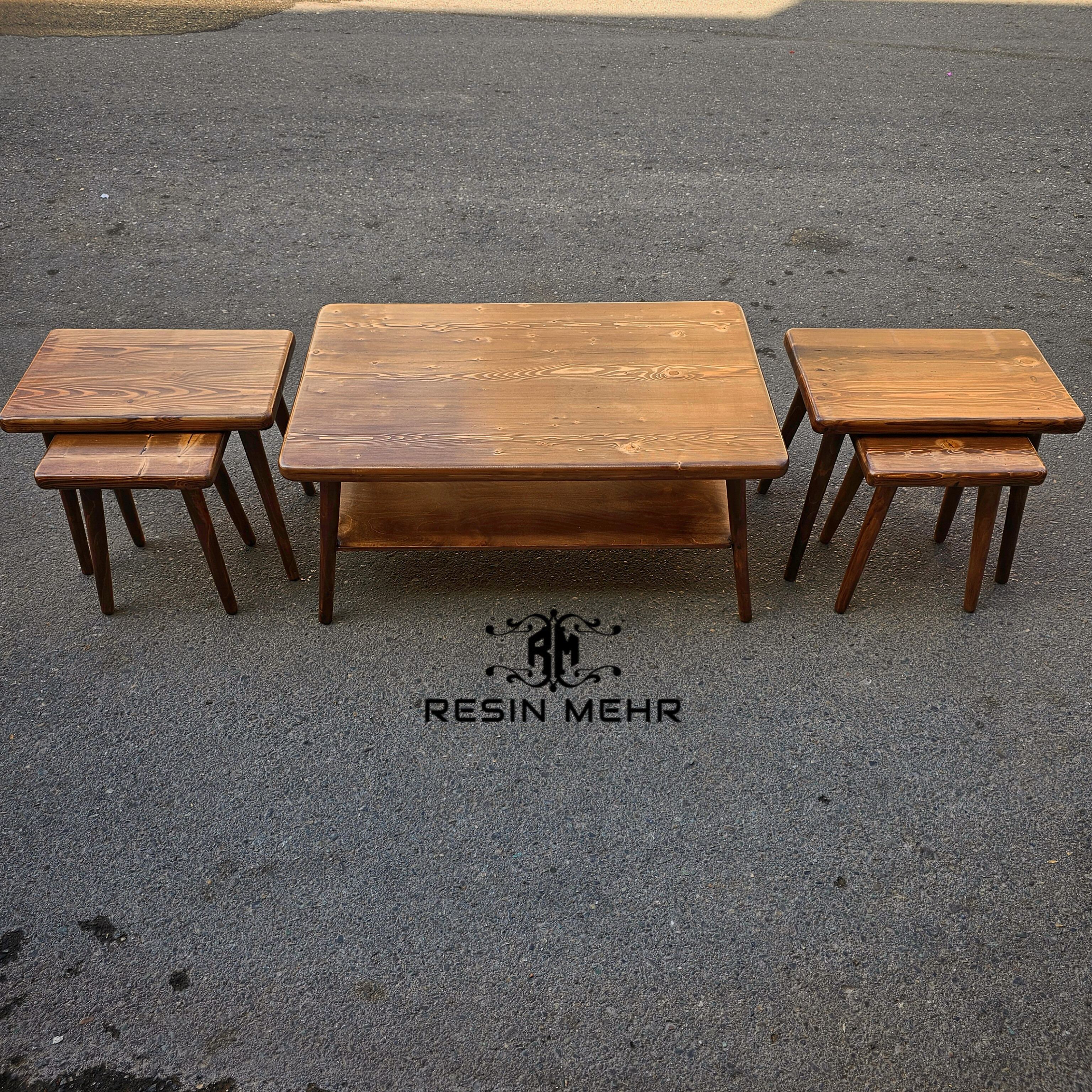جلومبلی-عسلی کلاسیک با چوب نَرّاد روسی با پوشش نهایی پلی اورتاننیمه مات و پایه چوبی با چوب نراد روسی. ابعاد میز جلومبلی طول ۱۱۰ و عرض ۷۰سانت و دو طبقه و ارتفاع ۴۵ سانت و عسلی ها نیز به تناسب کوچک تر هستند. ضخامت میز ها ۴ سانت می باشد.