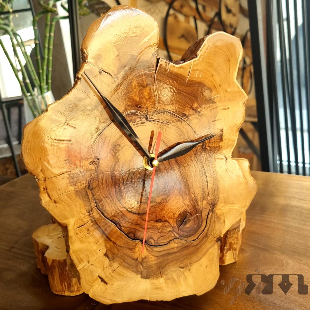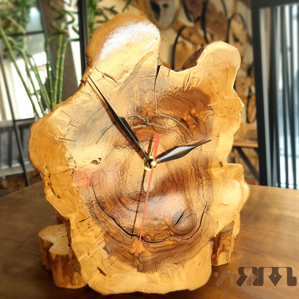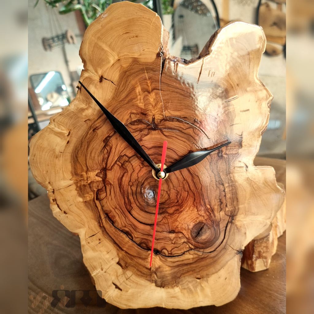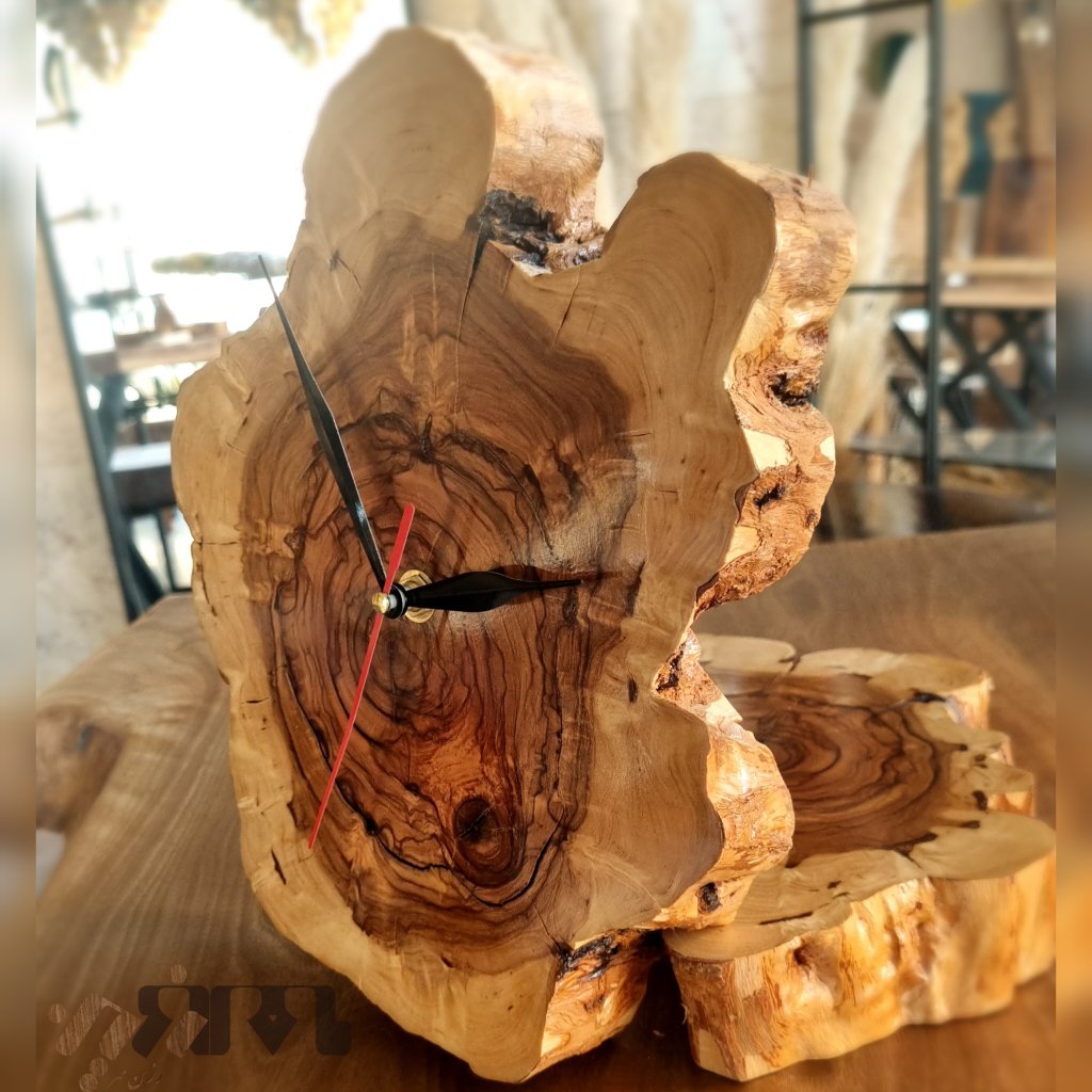 ساعت رومیزی روستیک، ساخته شده با چوب زیبای زیتون در سایز تقریبی ۲۰_۲۵ سم * ۳۰ سم با پوشش پلی اورتان سوپر براق که در پوششهای مات به رنگ طبیعی خود چوب هم قابل اجراست. نوع موتور آرامگرد است.