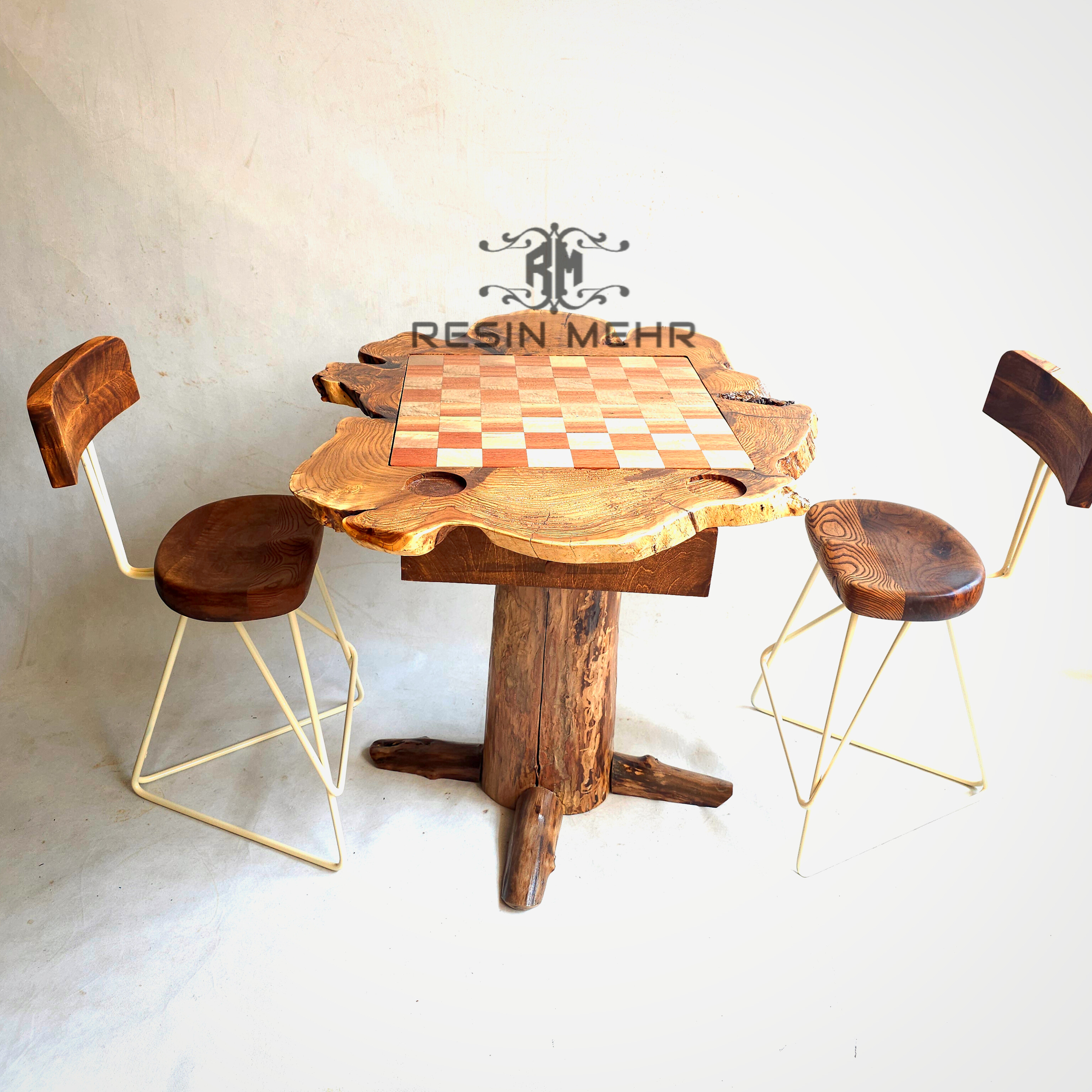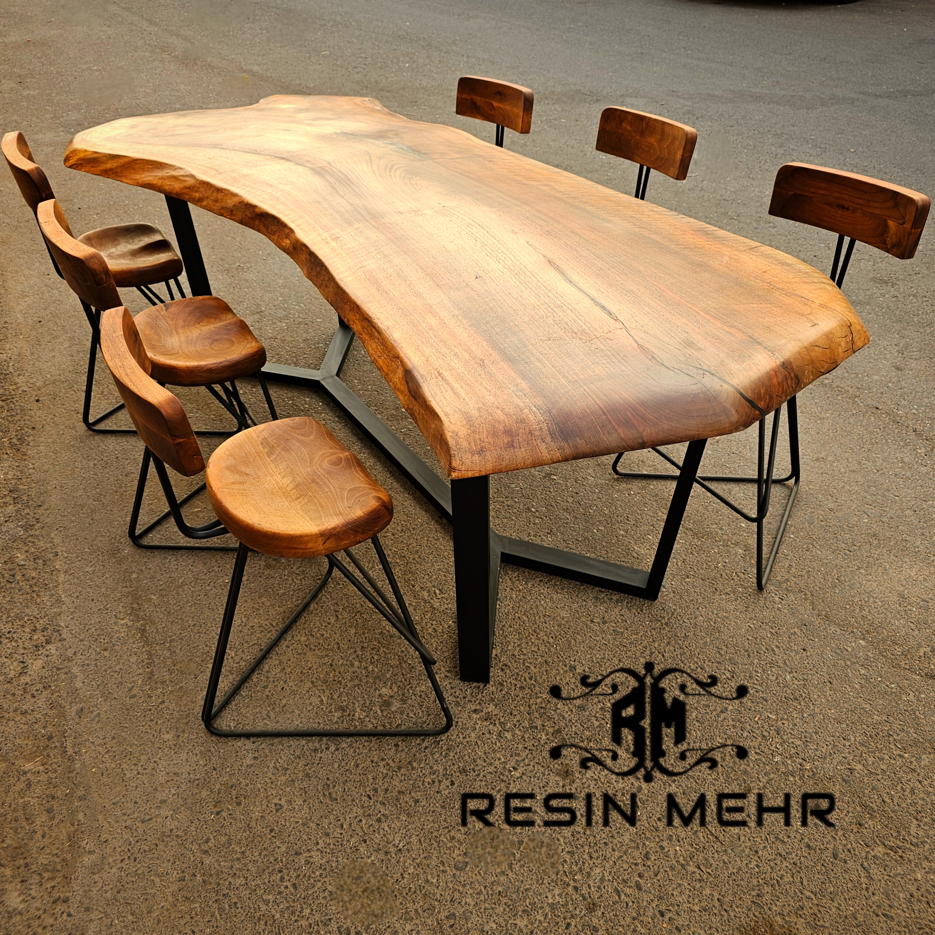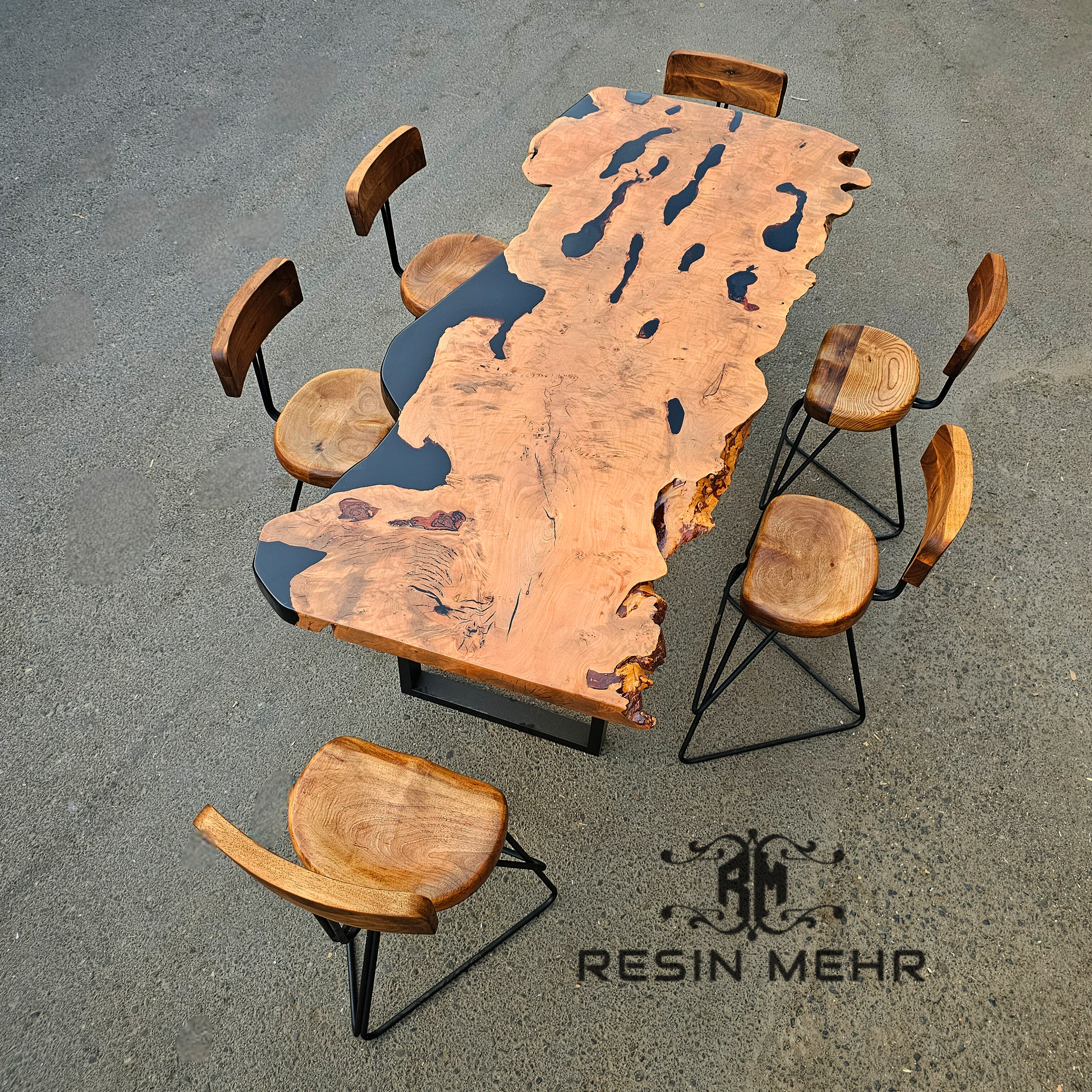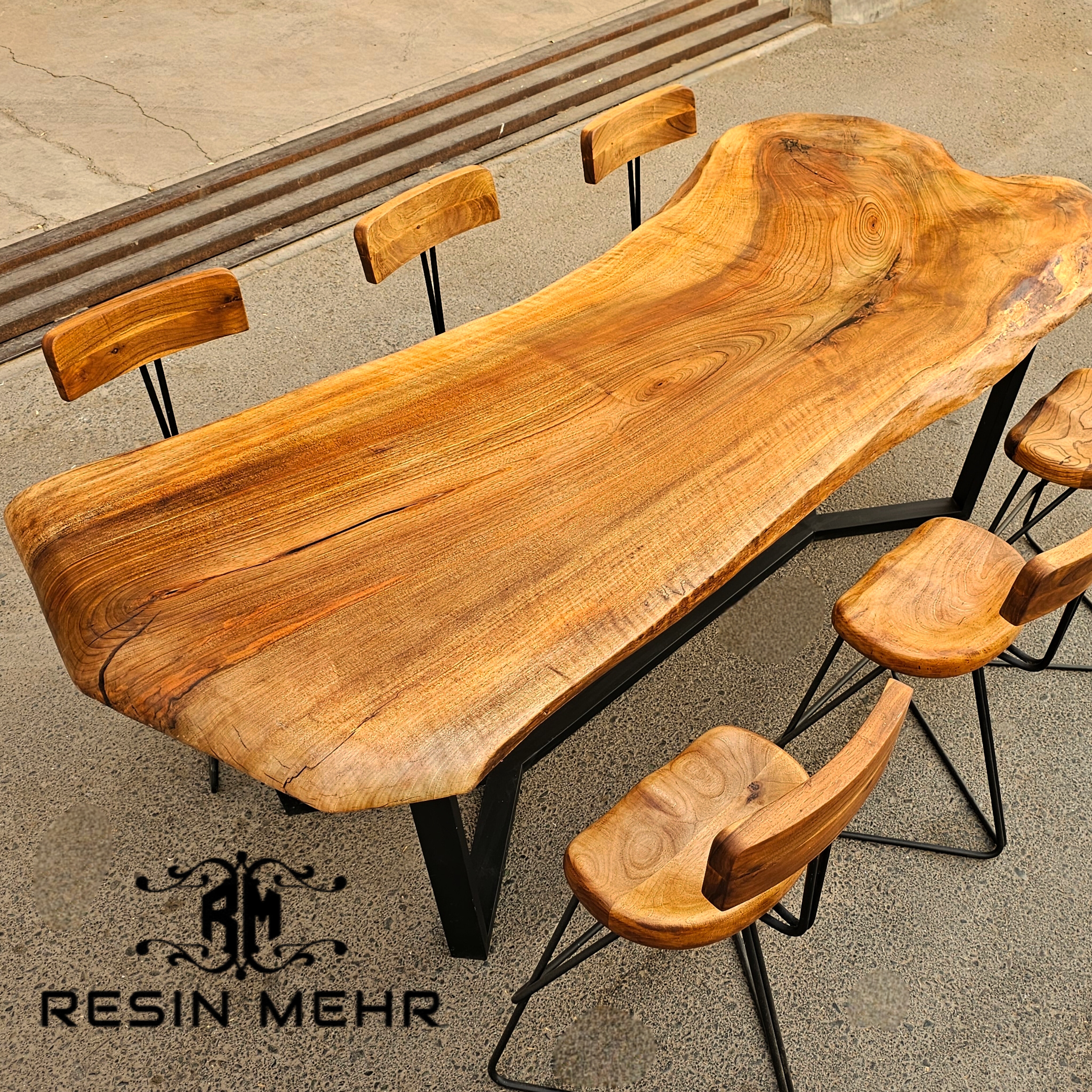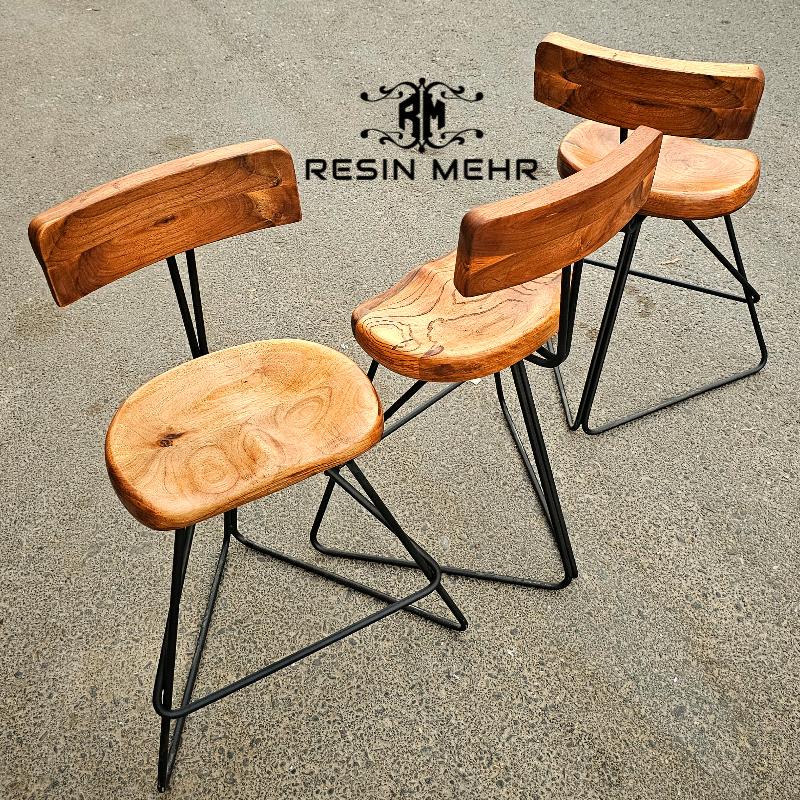 صندلی نهارخوری و کانتر زین اسبی با نشیمن چوب گردو طبیعی خوش طرح و نقش درجه یک ایرانی است. ترکها و حفرهها با رزین اپوکسی ترمیم شدند. این ترک ها و حفرهها در برخی از چوبها به علت طبیعی بودن یک اتفاق عادی و رایج است و با اپوکسی ترمیم میشود که بهترین گزینه برای ترمیم به شمار میرود. اندازه نشیمن حدود 30 الی 40سم است و از پوشش روغن گیاهی درجه1 طبیعی مخصوص چوب برای پوشش سطح چوب استفاده میشود. پایههای این صندلی فلزی با میلگرد 12میل و رنگ مشکیِ کورهای سوپرمات برای عزیزان رزینمهری تولید میشود.