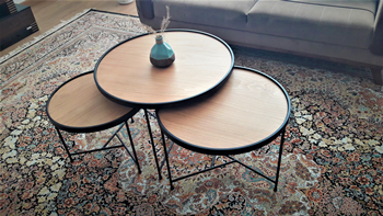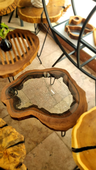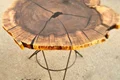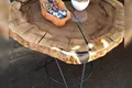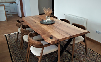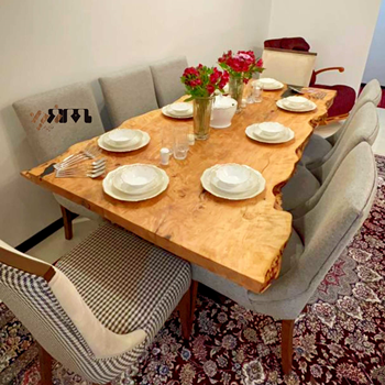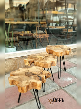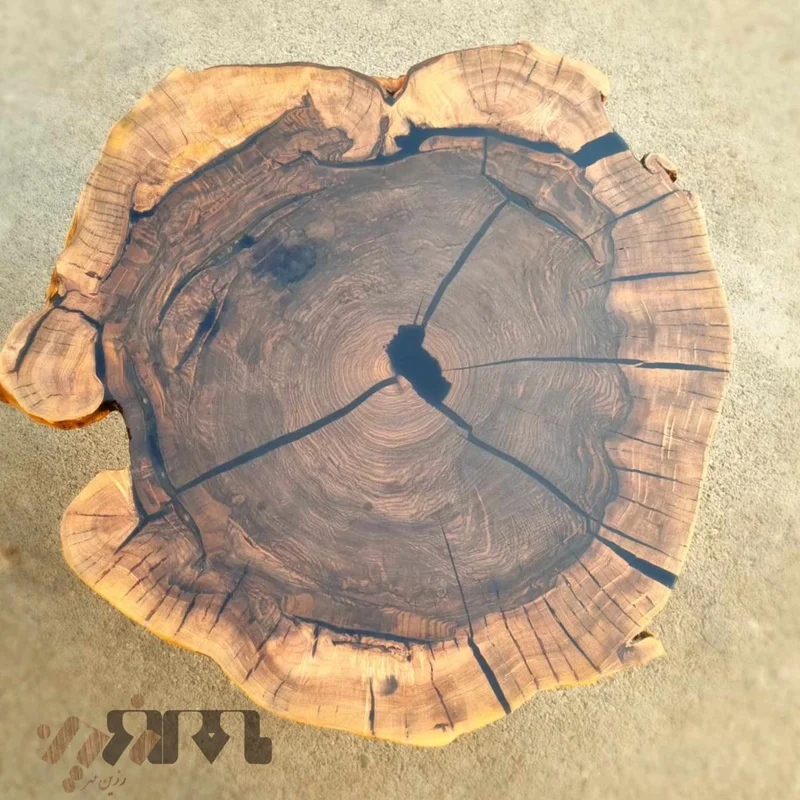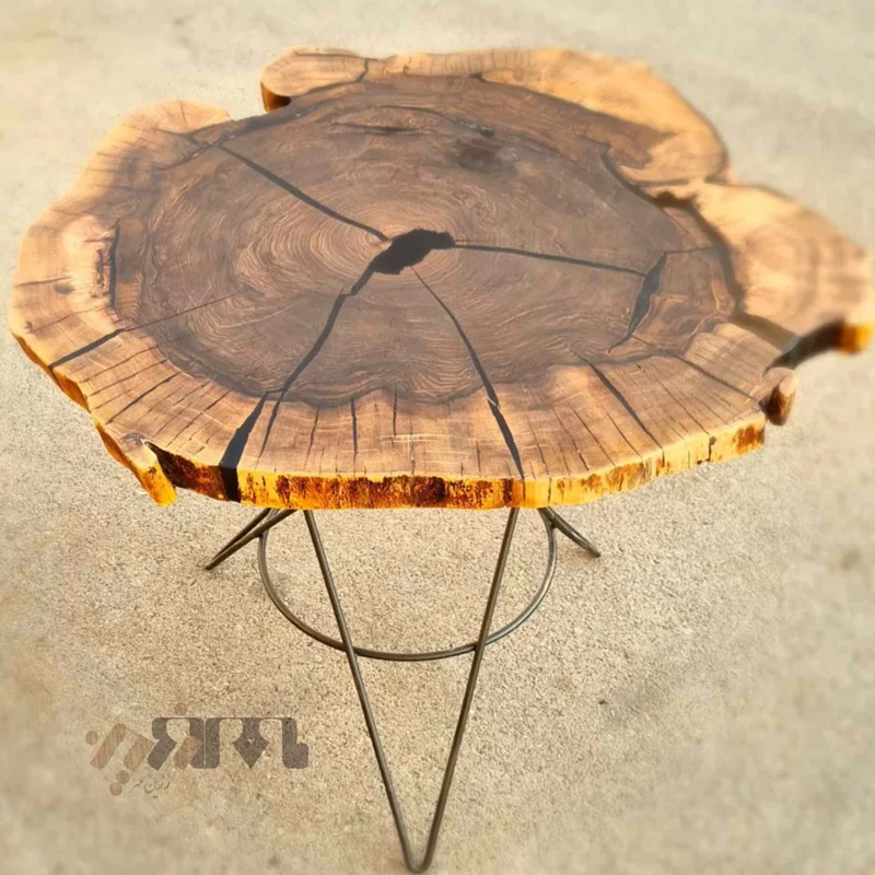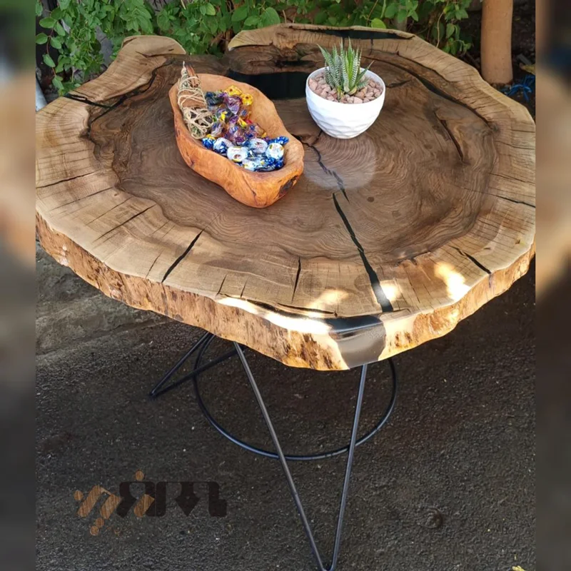 میز جلومبلی یا غذاخوری سبک روستیک «که به عنوان میز ناهارخوری تا 2نفر و به عنوان میز خاطره و قهوه خوری تا 3نفر ظرفیت دارد». چوب استفاده شده، چوب بادوام ، زیبا و خوش نقش گردو سیاه ایران است که کیفیت و رنگ خاص آن طرفداران خاص خود را دارد. این میز روستیک گردویی زیبا در ابعاد «قطر حدودا 80 تا 90 سانتیمتر _کمترین و بیشترین سایز با توجه به روستیک بودن_»ساخته میشود. تمام ترکها و حفرههای طبیعی چوب با رزین اپوکسی مشکی مات ترمیم شده که بهترین گزینه برای این کار هست. پوشش بیرونی کار از روغن گیاهی آلمانی رمرس است. پایههای فلزی ستارهای 70 برای ناهارخوری و 40 تا 50 سانتیمتر برای جلومبلی_سایز پایهها قابل تغییر به صورت سفارشی هستند_ تعبیه شدند. این پایهها به رنگ مشکی الکترواستاتیک مات است که توسط کوره رنگ میشود و مقاومت رنگ خیلی بالاتری نسبت به رنگهای پیستولهای دارد.